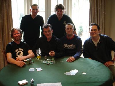 After a few somewhat staged early exchanges (what game we're going to play, buyins, payouts et cetera) we get underway at just after midday. Blinds are at 25/50 and two limpers round to Woody who makes it 200 to go from the SB. We lose Nick and Vincent and Barny calls to see a flop of As, Qh, 6c. It goes check-check and the Turn is a 10c. Woody checks again and Barny bets 275. Woody agonises for a few seconds and eventually folds, saying "too many overcards", and shows his pocket nines, so Barny takes great delight in showing him his rags - first bluff of the day!