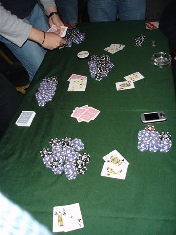 Now we were down to the final 4, and with the average chipstack up around 90K, blinds still only at 2K/4K and the big payouts going to the top 3 placed finishers the table tightened up considerably. Very often the first player in would be taking down the pot uncontested pre-flop. Finally, half way through the 2.5K/5K level Ray M became our 4th place finisher and it was down to Cathy, Rory and Mike. All three had contrasting styles. Cathy had been steadily building throughout the tournament, playing a studied but aggressive game, and had maintained the chiplead more or less throughout the last few levels. Rory, like Jim has mentioned, had been playing a quiet, patient game and was able to operate ‘under the radar’ for the most part – I had not seen him involved in too many confrontations but somehow he had been steadily accruing chips (maybe he had been helping himself from Cathy’s stack when no-one was looking – Rory?) Mike was probably the most vocal of the three remaining, and had been doing his best to get inside his opponents heads. Not, I hasten to add, with a cranial saw and a rusty spoon, that would have just been messy. From what I'd seen Mike had been picking his spots well and basically playing solid, aggressive poker. I think when it got down to 3 he was the shortie but would clearly be a danger if only he could get some chips. He didn’t have to wait long, as his unimproved AA soon helped him to double up through Cathy and now it really was anyone’s game….