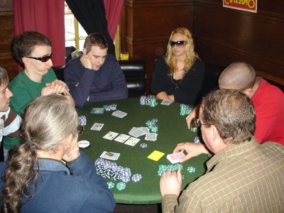 Sunday 13th November was sunny, clear and bloody taters, and Chewie and I arrived at The Walrus early, so rather than stand around outside freezing our knackers off we decided to interrupt Tony’s breakfast and get early access to the room to set up. Just as well we did, as we were soon to discover there had been a lesbian’s birthday bash in the function room the night before (hence the ‘Trailer Trash this way' greeting you as you mounted the stairs) and there was quite a bit to do before we could get down to the serious business of taking people’s money (least of all taking down all the effing pink balloons and bunting). Dave B and Chewie got busy stacking up 400K in chips into 54 nice little even piles (ta lads), Christine was fully occupied opening, counting and shuffling 12 decks of cards (thanks Christine!) and I did my best to look busy and important by shuffling papers, looking cross, and doodling. It was an absolute frenzy of activity, and a quick glance out the window revealed a veritable throng of chilly-looking poker junkies gathering outside clamouring for Tony to let them in out of the cold.