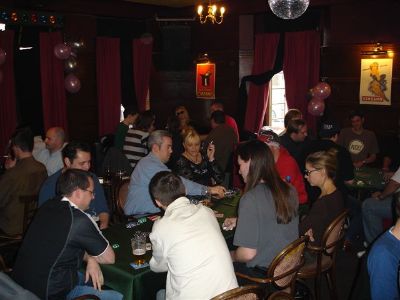 At 11:15am a deluge of players exploded through the doors waving tenners, shrapnel and assorted (clearly home made) IDs, and we got busy signing them up and getting them seated while Camille did her best to cater for the numerous demands for teas and coffees coming from every quarter (you’ll be pleased to learn that bacon butties may well be on the cards for next time!) The initial flood then slowed to a trickle as stragglers started to arrive and the inevitable texts and calls started to filter through from the usual quarters - “Not going to make today. Got drunk. Short story. Have fun and do a 72o limp re-raise for me” - and similar offerings, and I started putting lines through players’ names. By the time the clock ticked round to noon with latecomers we were down to 50 of the promised 54 runners (exactly the same number as at BHO I) over 6 tables and a little after the scheduled midday start the customary ‘Shuffle Up and Deal!’ was announced (after a little prompting!) and we were off and running. Or perhaps off and ‘sprinting’ might have been a better term…