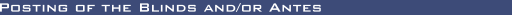 The placing of these predetermined bets is called "posting the blinds." Most often, the "first blind" - the player immediately to the left of the dealer - puts up half the minimum bet, and the "second blind" puts up the full minimum bet. These are called the Small Blind (SB) and the Big Blind (BB) respectively. The amounts of the blinds increase gradually as play commences according to the Blinds Structure. In many games in addition to the blinds all players also post 'antes' which are smaller forced bets also placed into the pot to encourage action (we play antes and blinds).